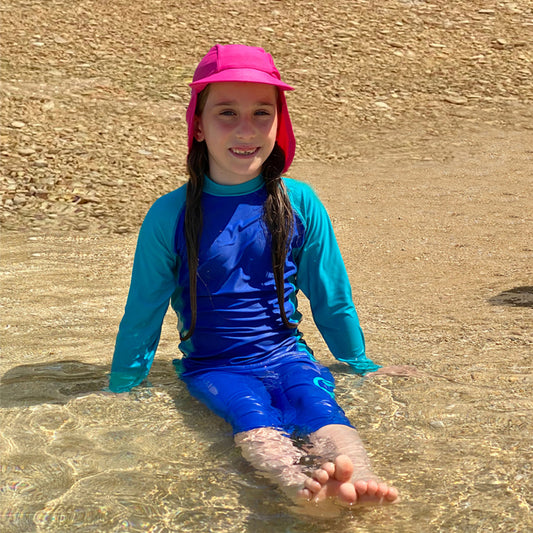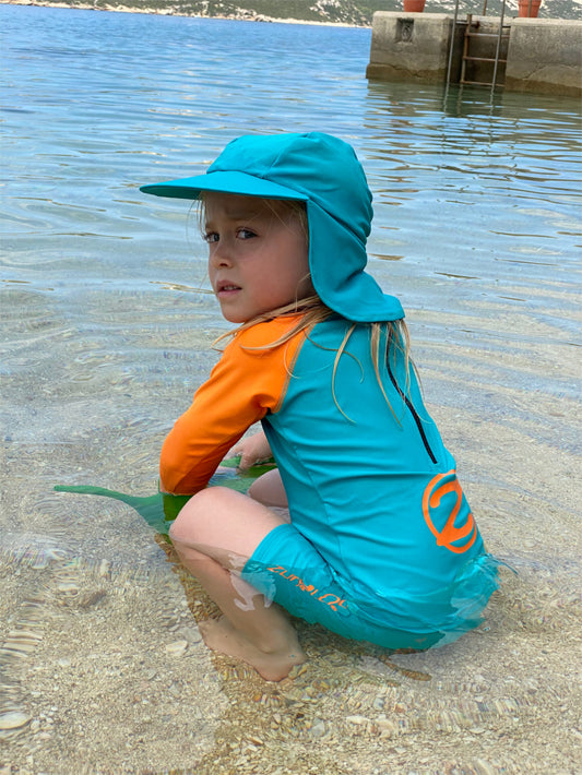 Traje de baño polera m.larga+pantalón ¾ azul/esmeralda UPF 50+ marca Zunblock