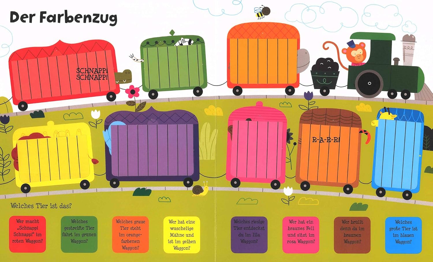 Wer versteckt sich im roten Eisenbahnwaggon? Welche Farbe hat der Frosch? Und wie viele rosa Elefanten entdeckst du im Spielzeuggeschäft?