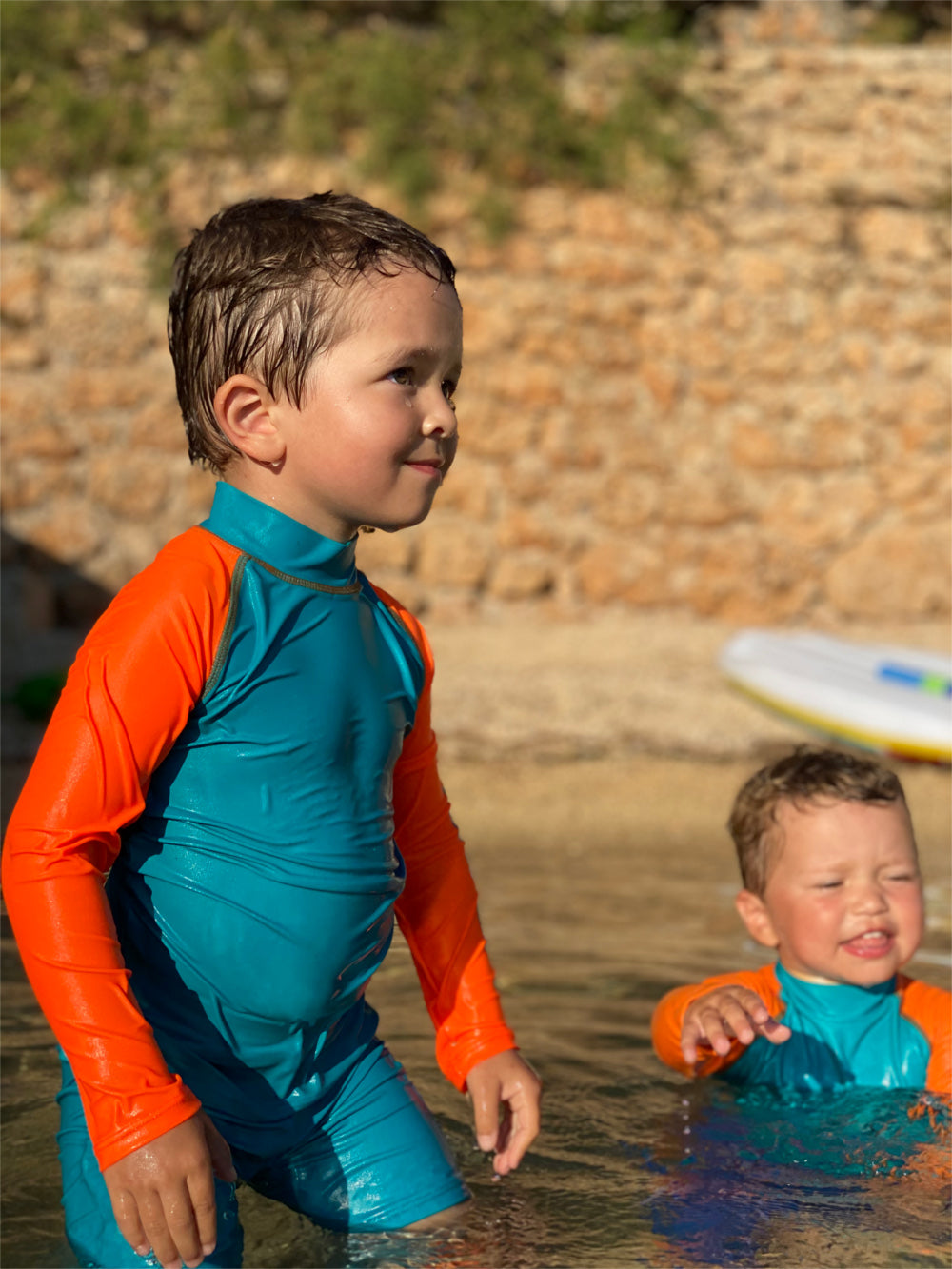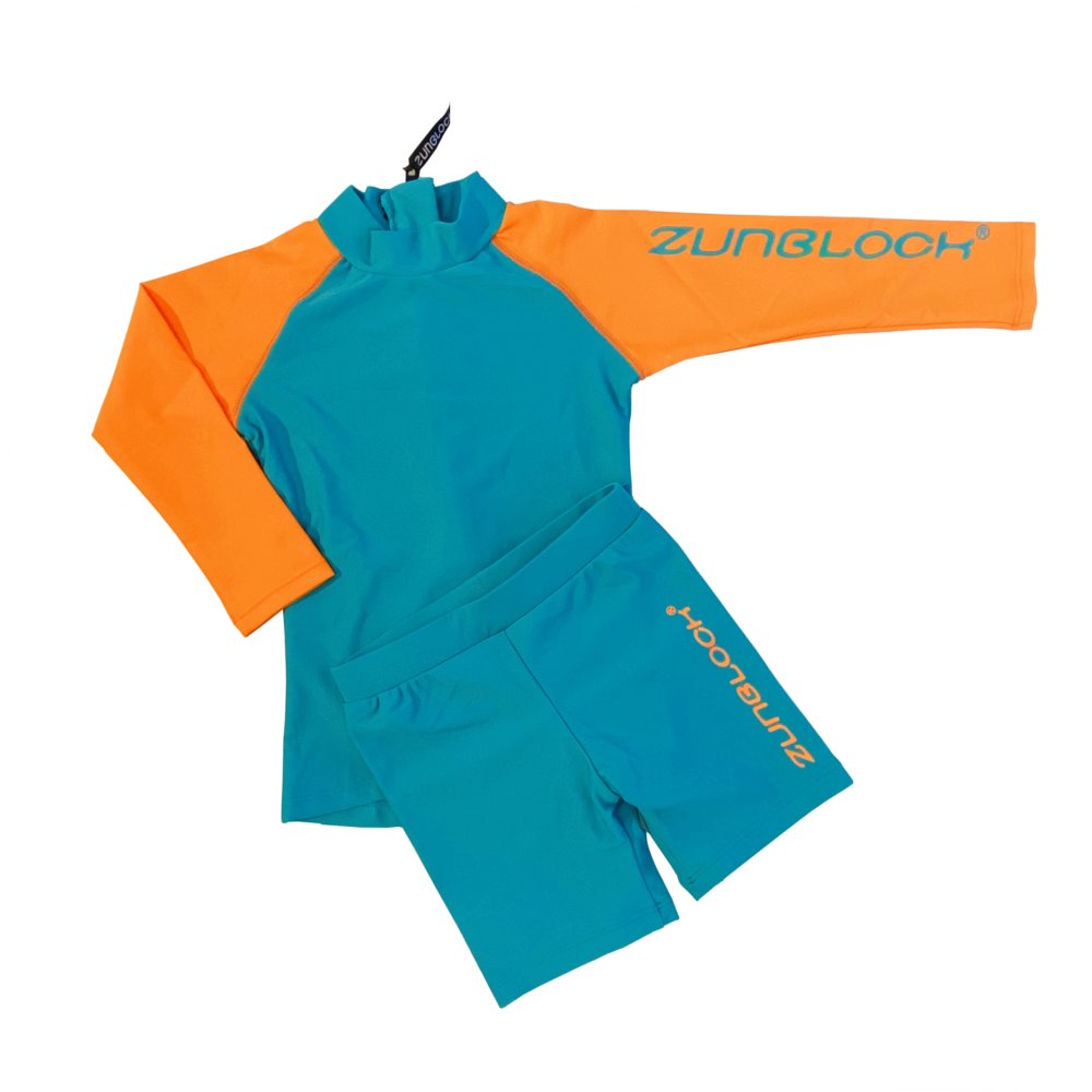 ★★★★★Traje de baño polera m.larga+short esmeralda/naranjo UPF 50+ marca Zunblock, es perfecto para realizar deportes náuticos en la piscina o en el mar, bañarse, andar en bicicleta, ir de excursión o simplemente para caminar por la ciudad. La protección UV UPF 50+, significa que el 98% de los rayos UVA Y UVB que llegan a la tela no la traspasará, protegiendo de esta manera la salud de tu hijo(a) y evitando una exposición excesiva a los peligrosos rayos UV. Set esmeralda/naranjo polera m.larga+short está fabricado de lycra con un 80% Poliamida y 20% Elastano. La tela es respirable, el secado es muy rápido, así tiene la máxima protección tanto dentro como fuera de agua.